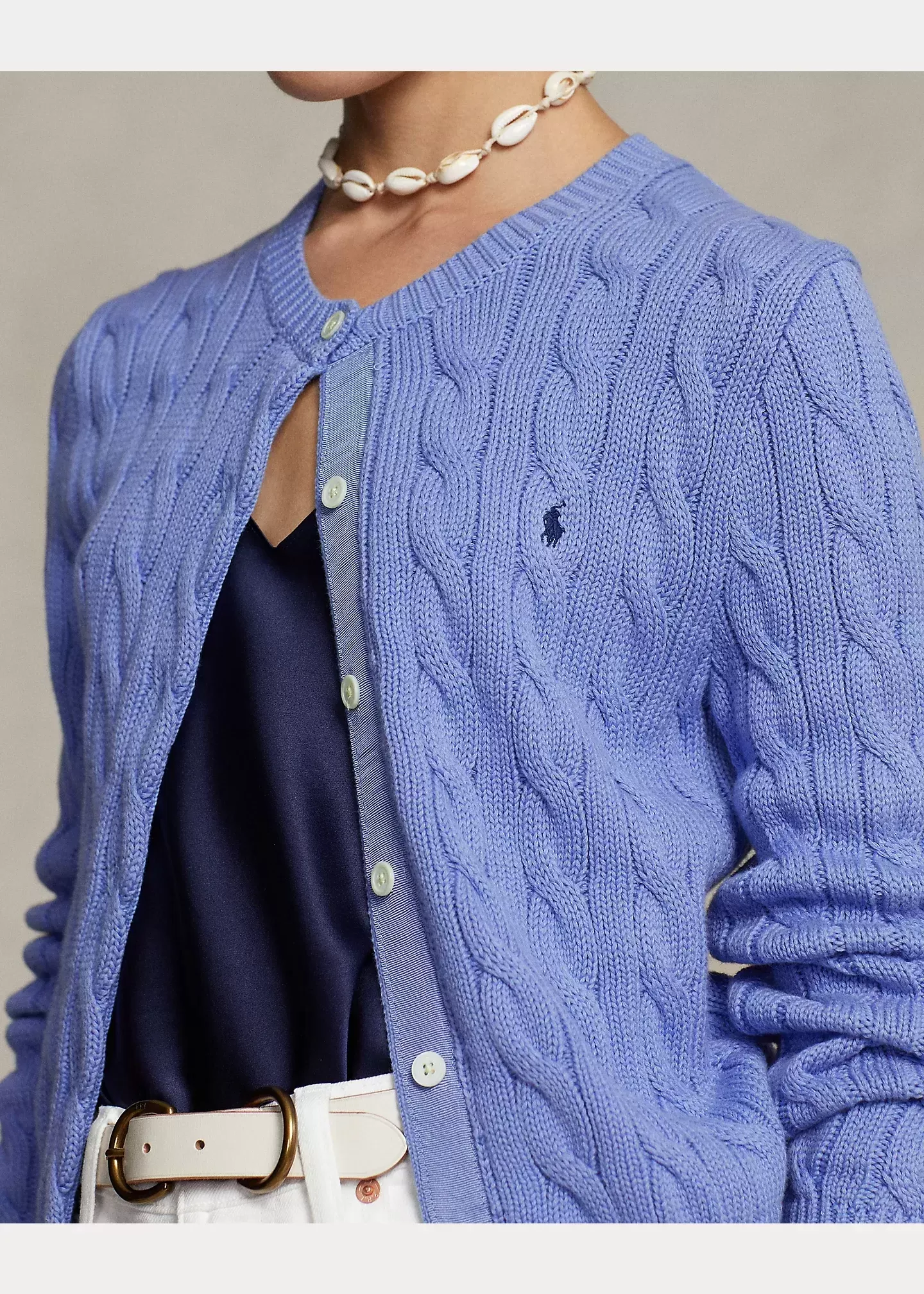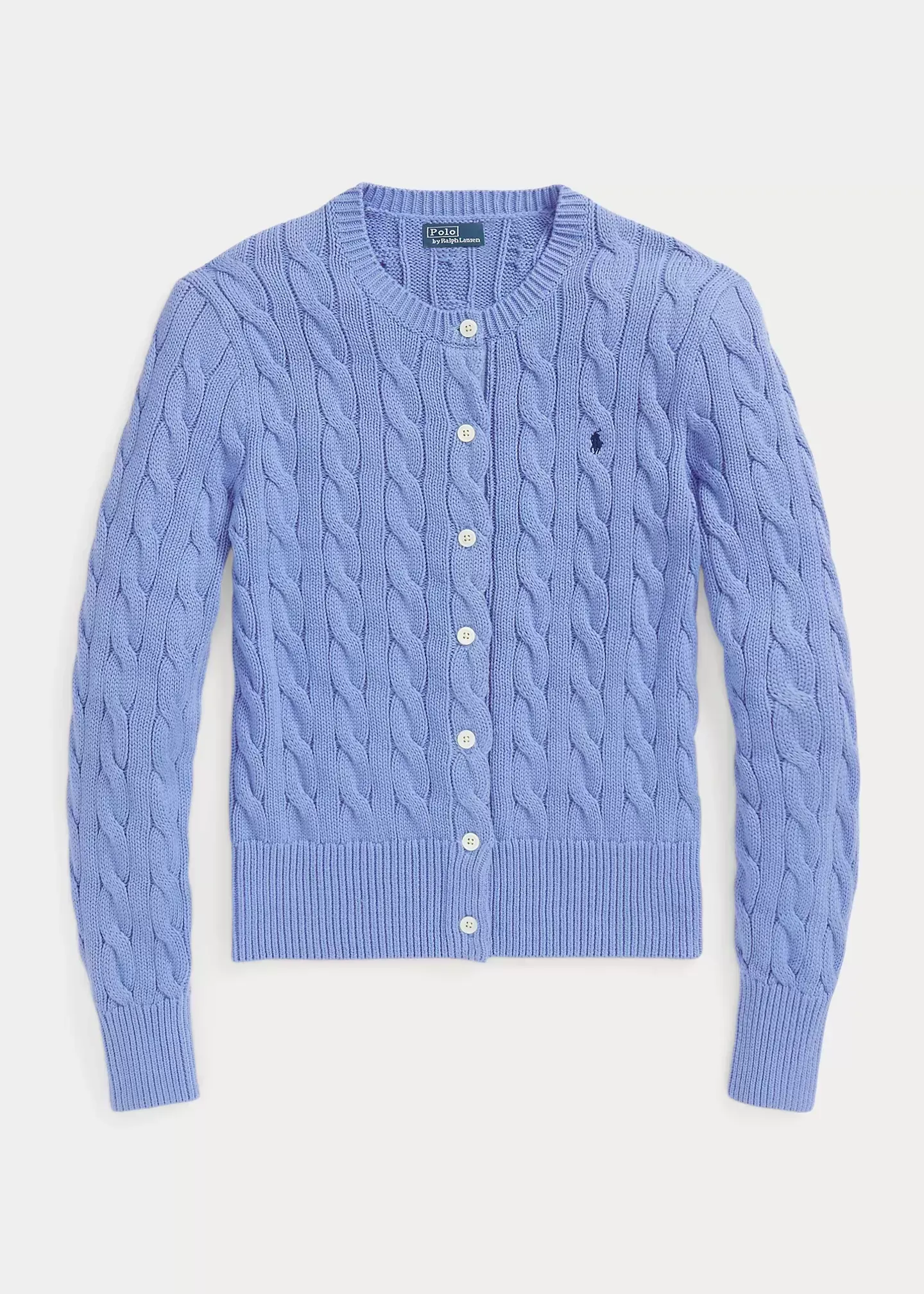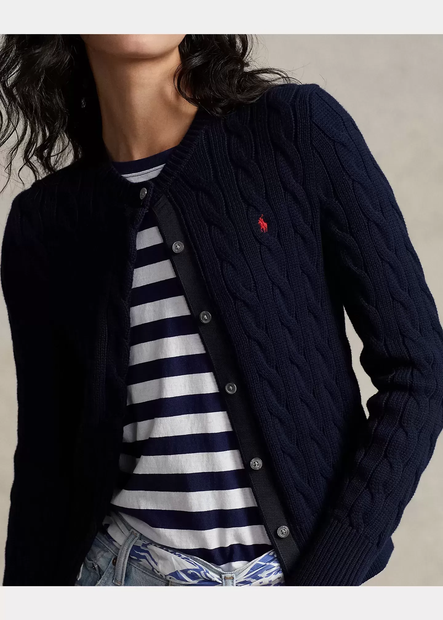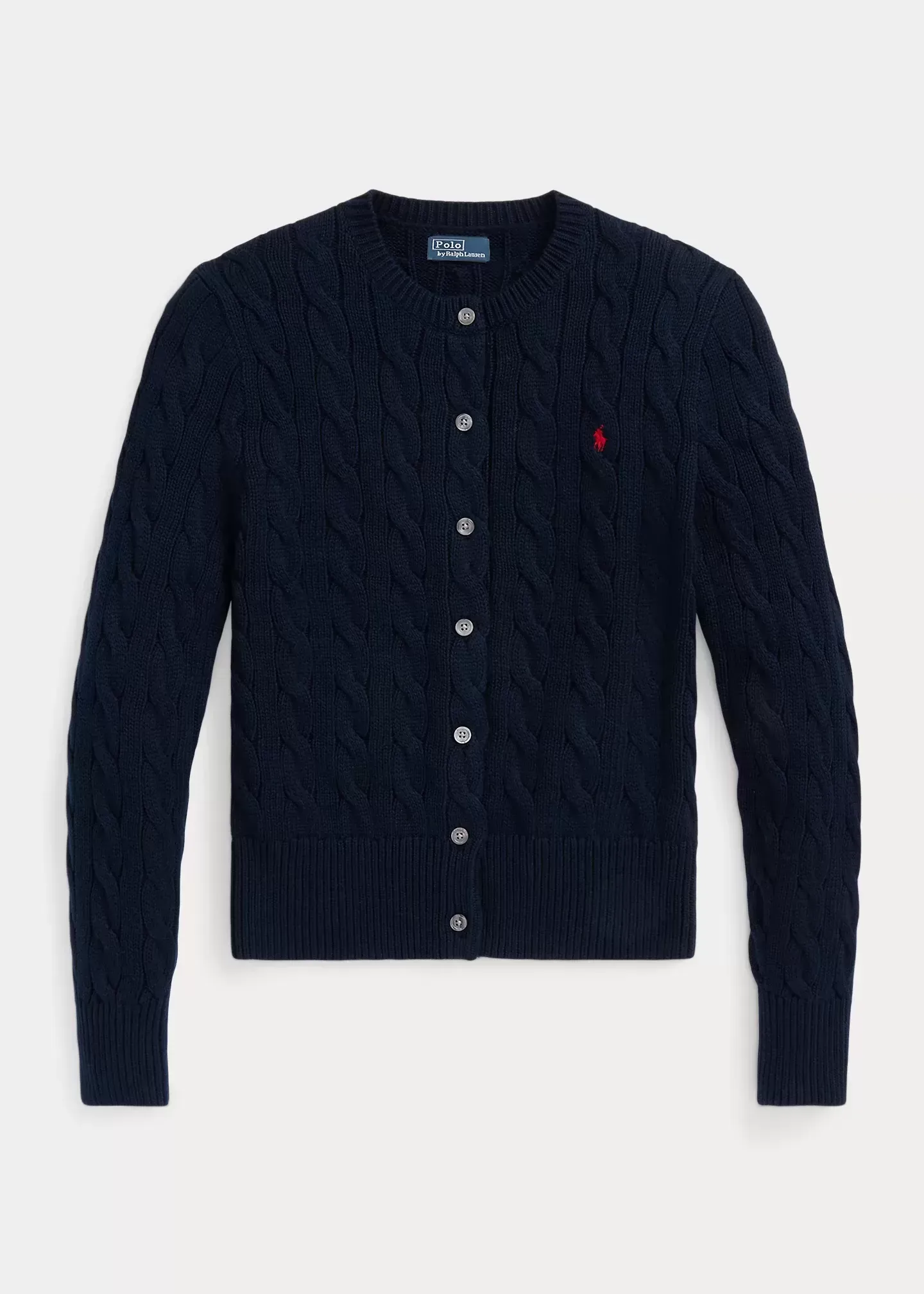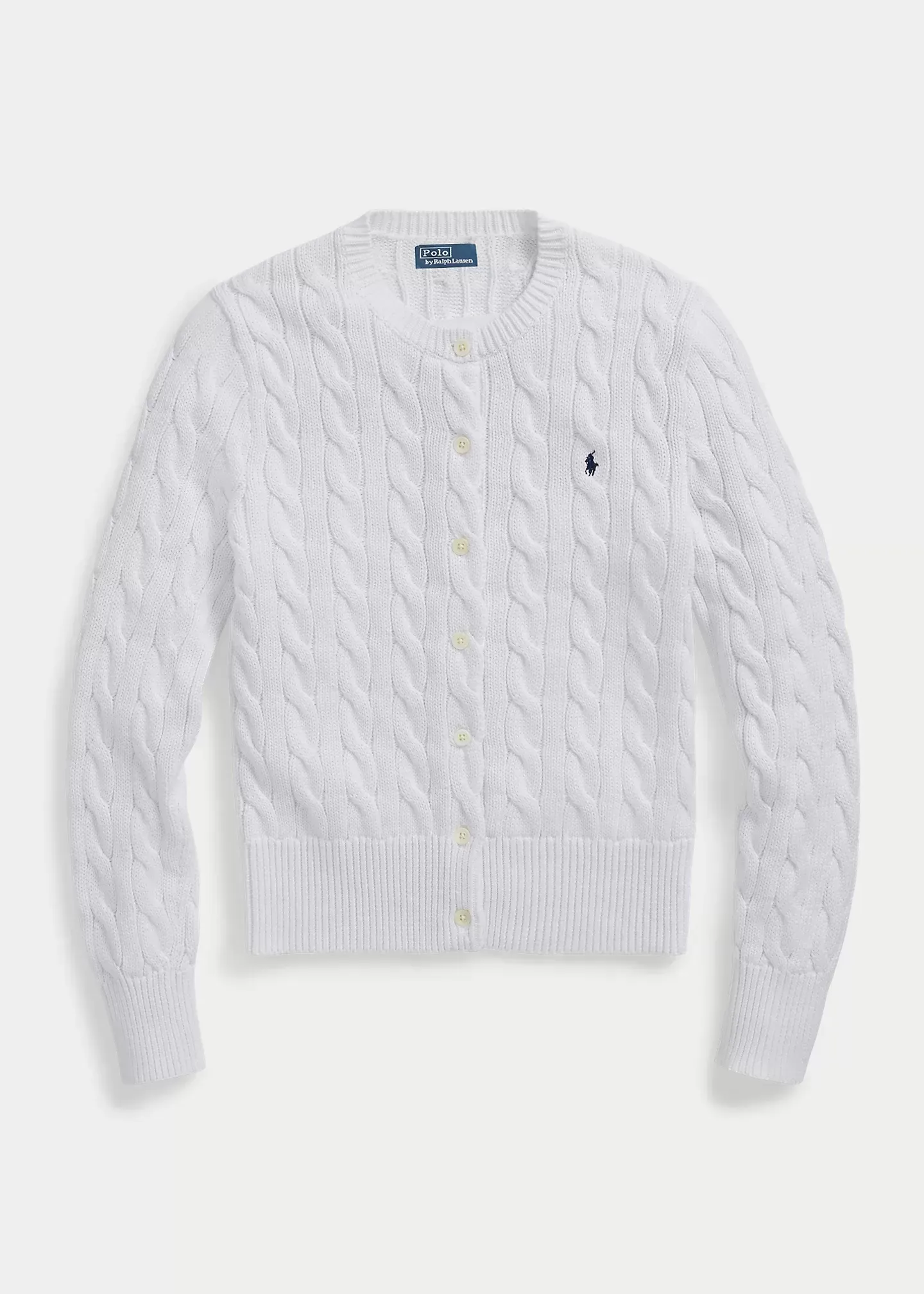 Cable-knit with pure cotton, this slim crewneck cardigan is finished with the signature embroidered Pony at the chest.