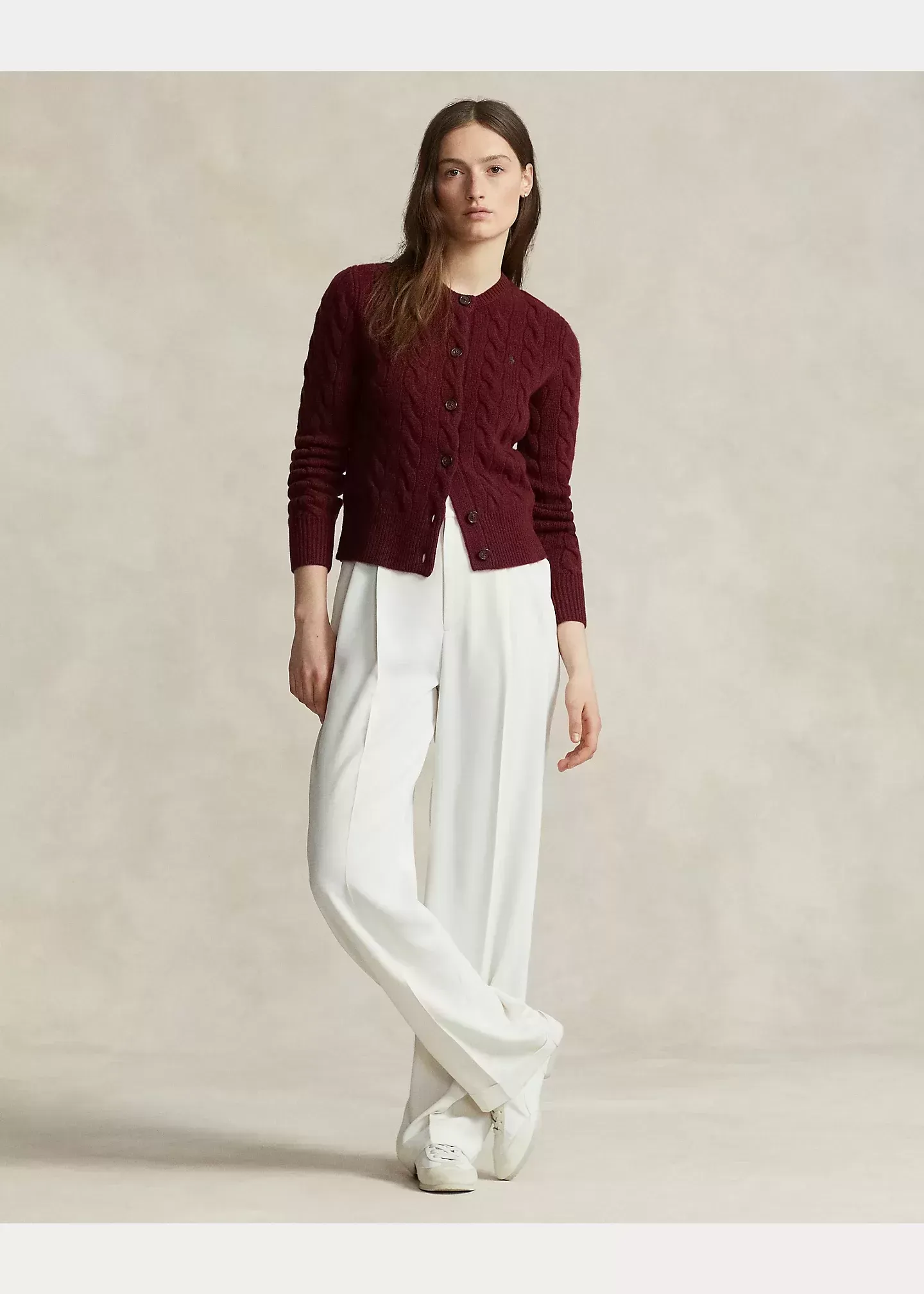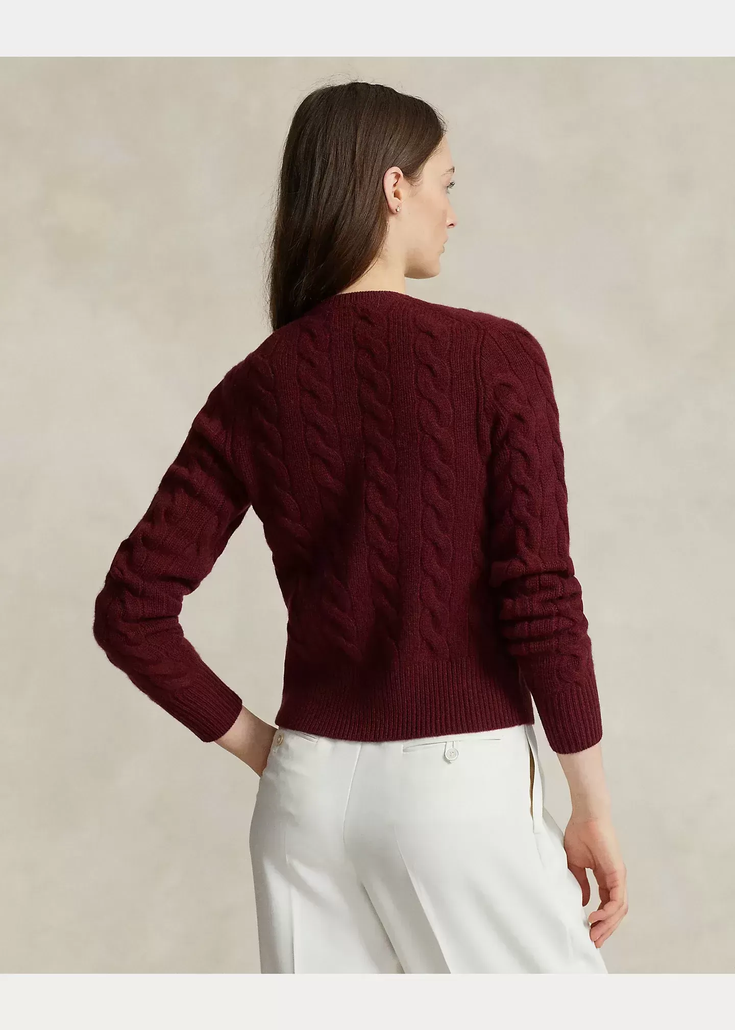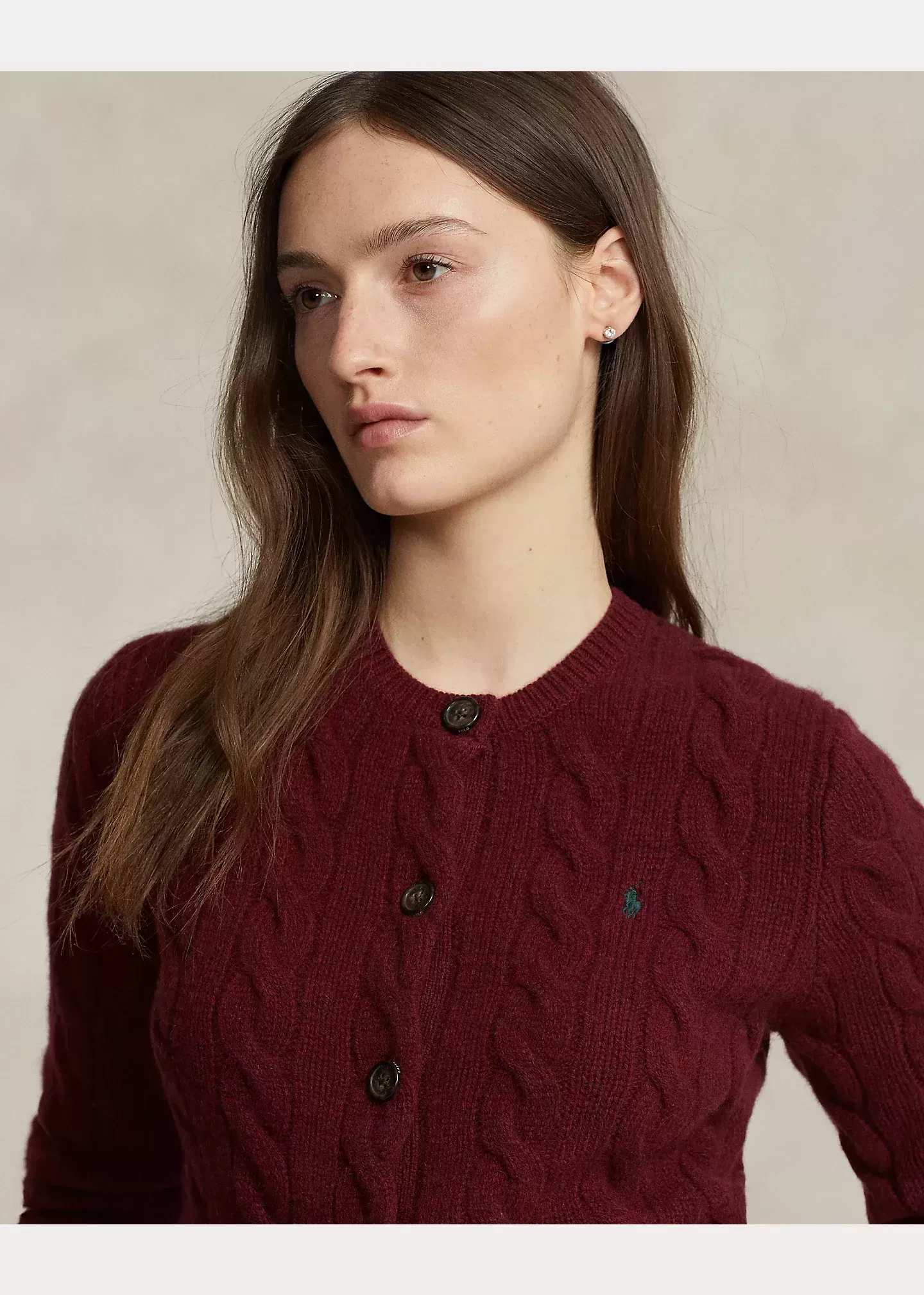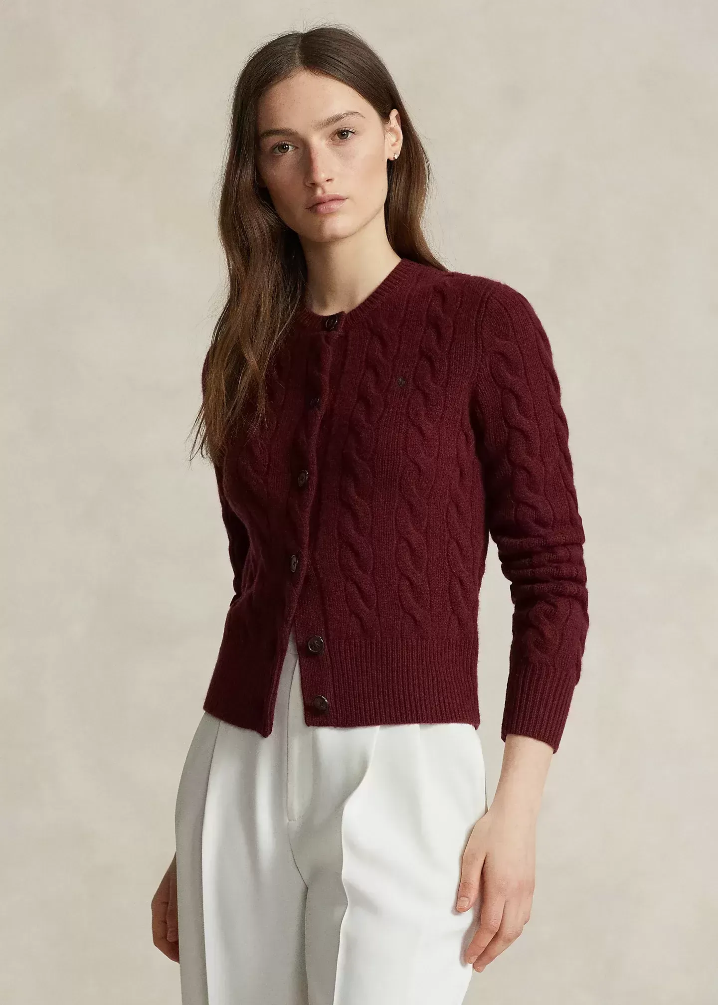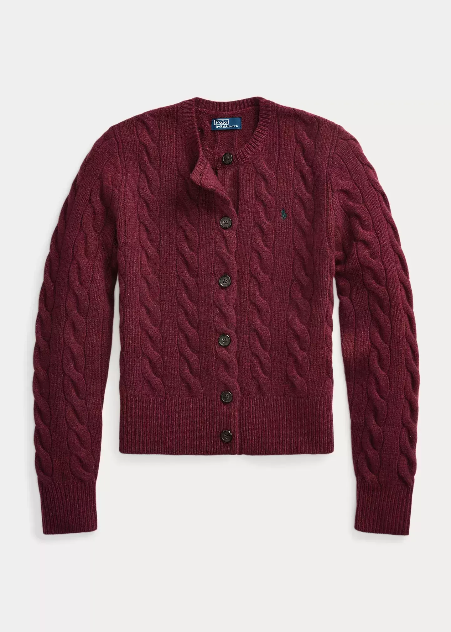 Made with a blend of Italian wool and cashmere for a soft hand and a fluid drape, this cable-knit cardigan with a seamless scalloped placket is accented by our signature embroidered Pony at the chest.