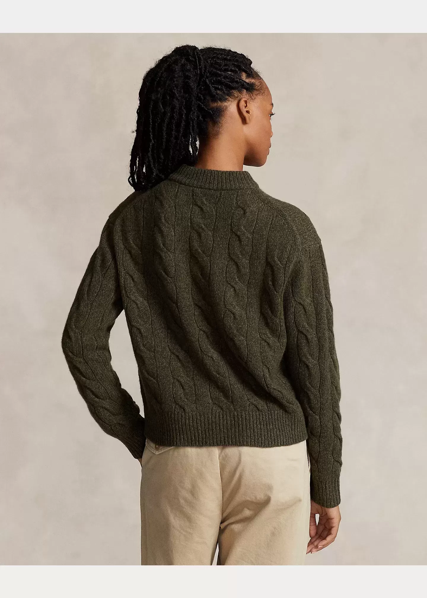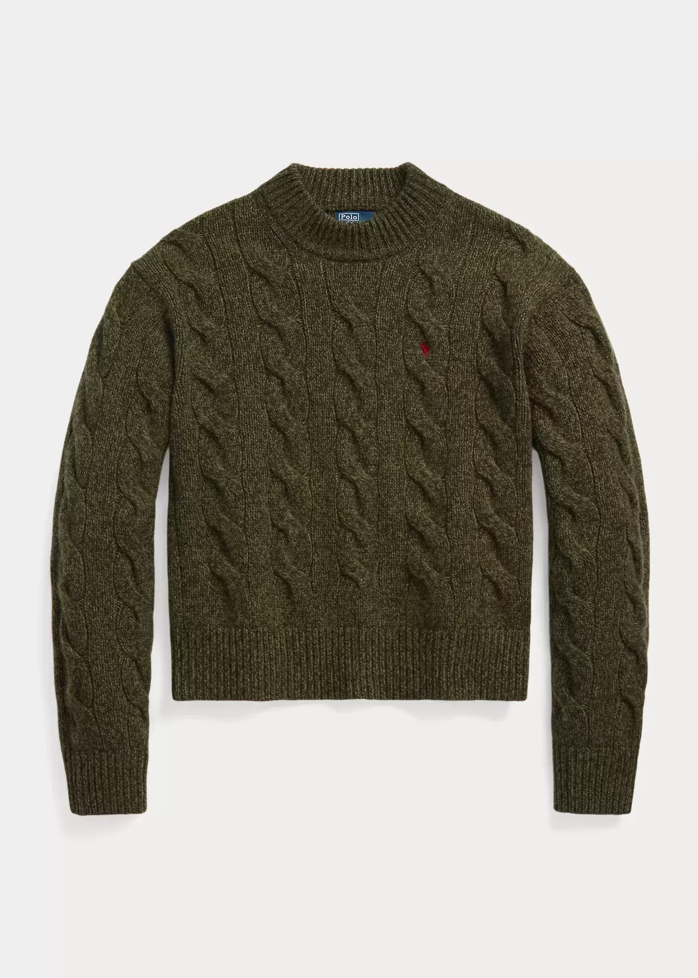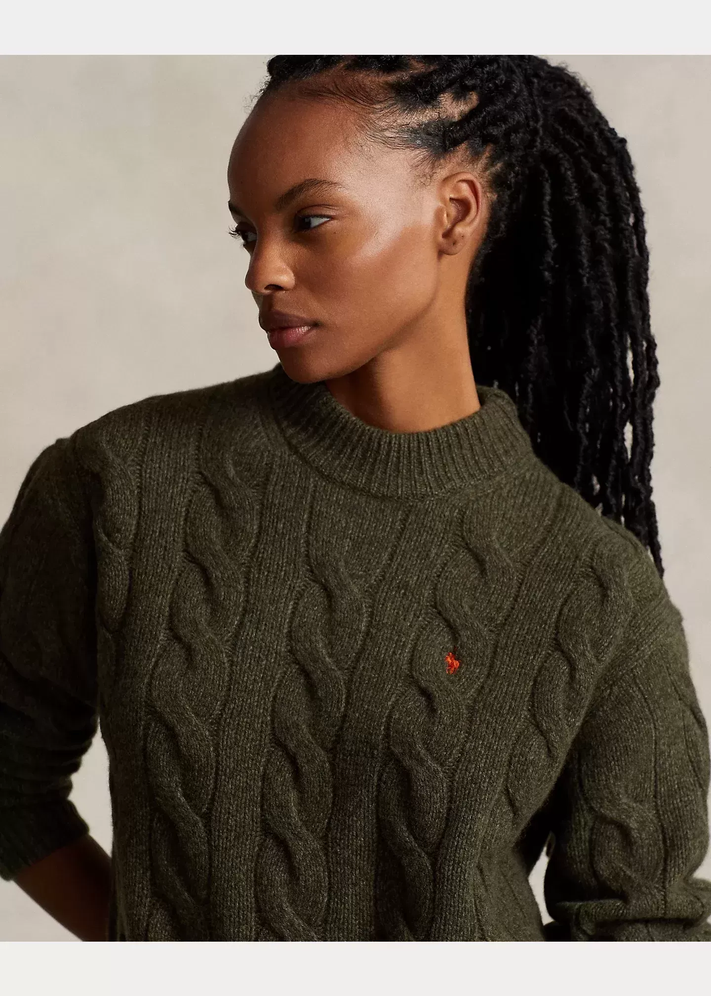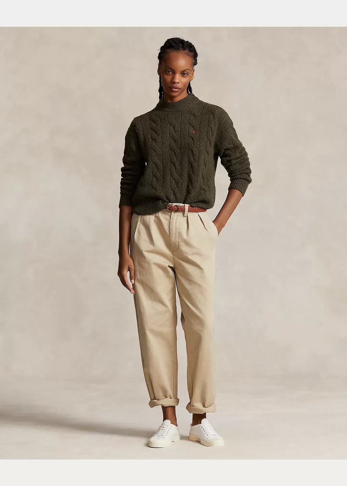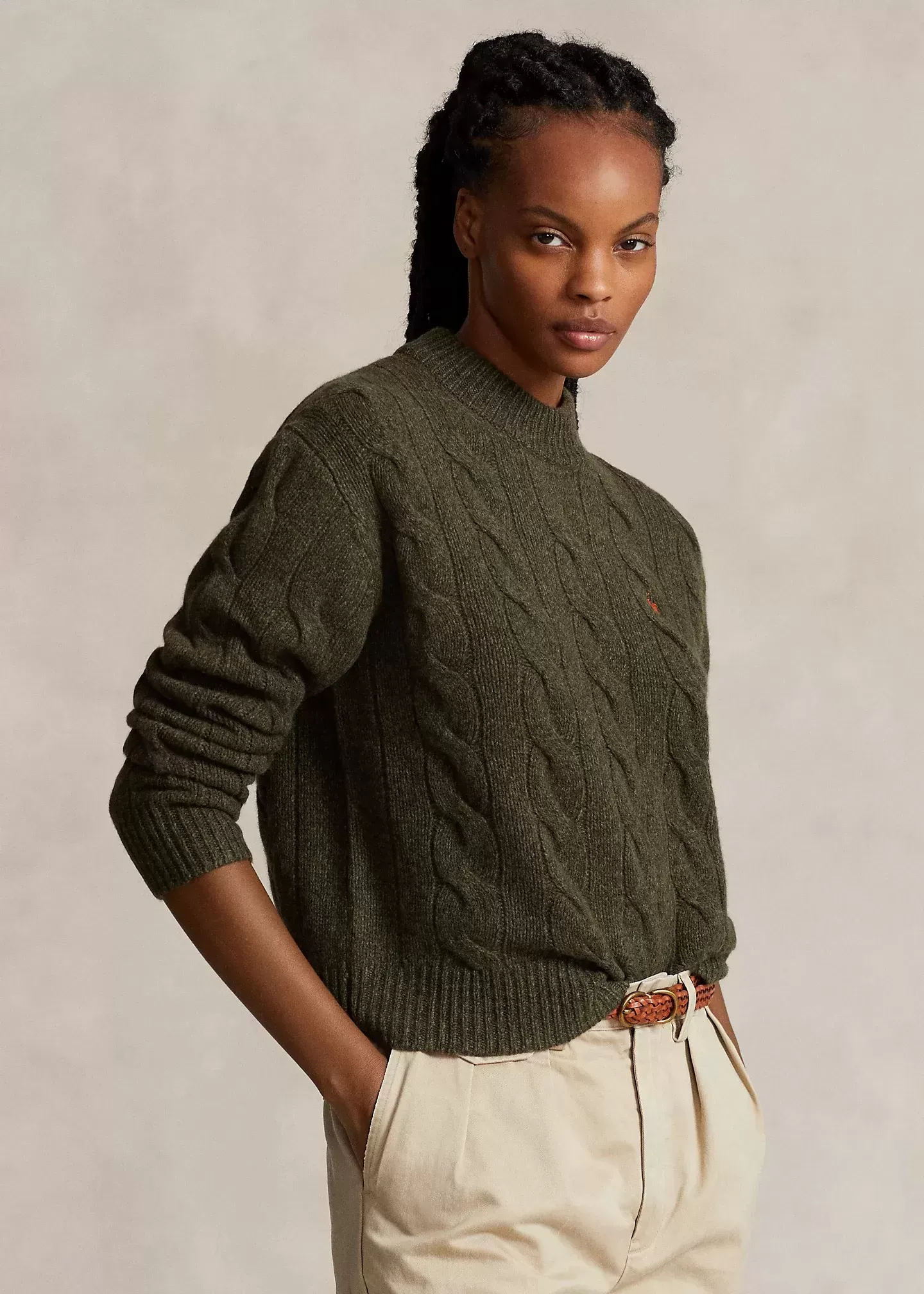 Crafted with a blend of Italian wool and cashmere, this mockneck cable-knit sweater is designed with a relaxed-fitting silhouette and a donegal-inspired texture.
