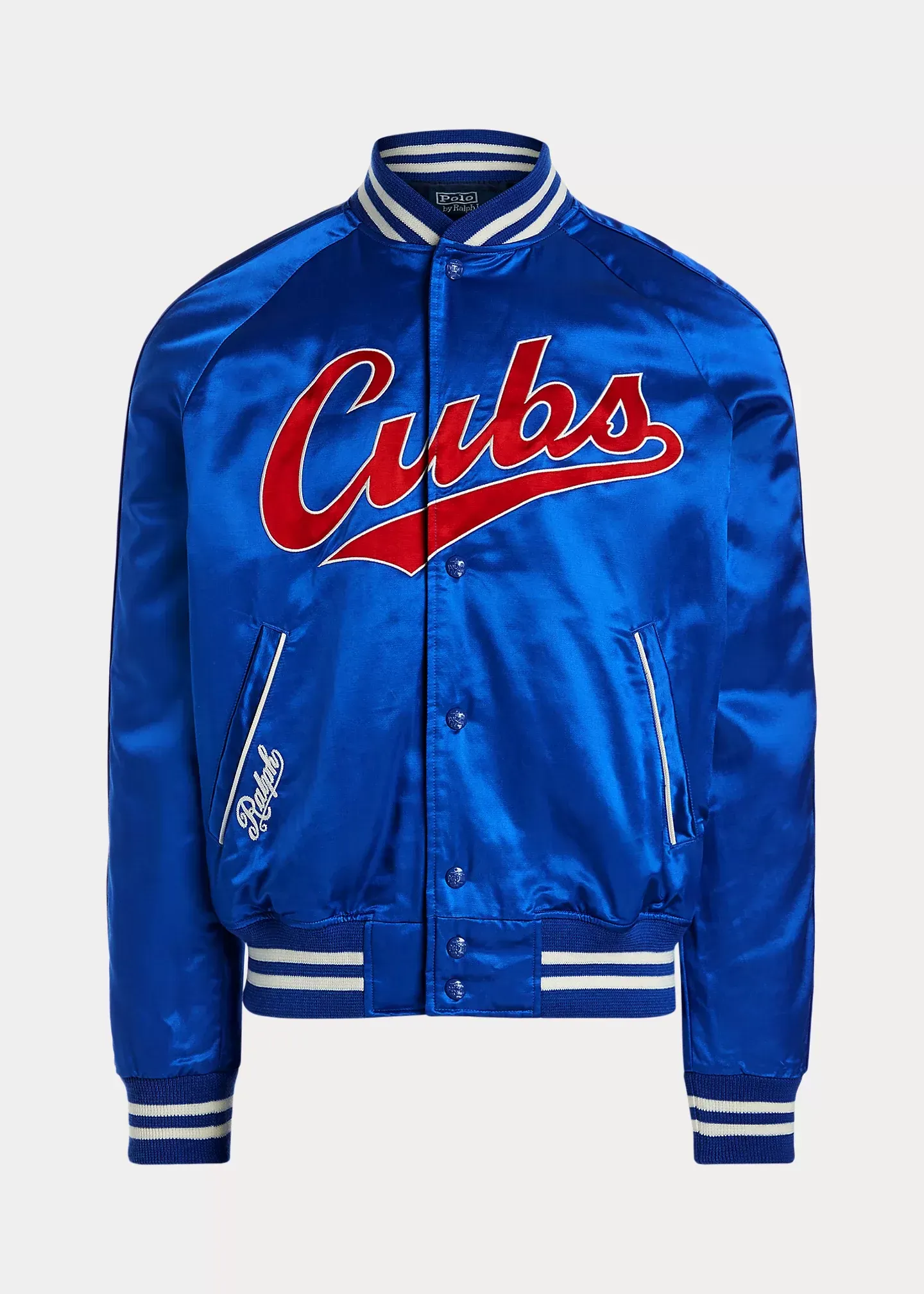- “Ralph” script embroidered at the right pocket. Interior left chest pocket. Appliqués spelling out “Ralph Lauren” and a Chicago Cubs™ logo patch at the center back. Striped ribbed hem. Fully lined and filled.