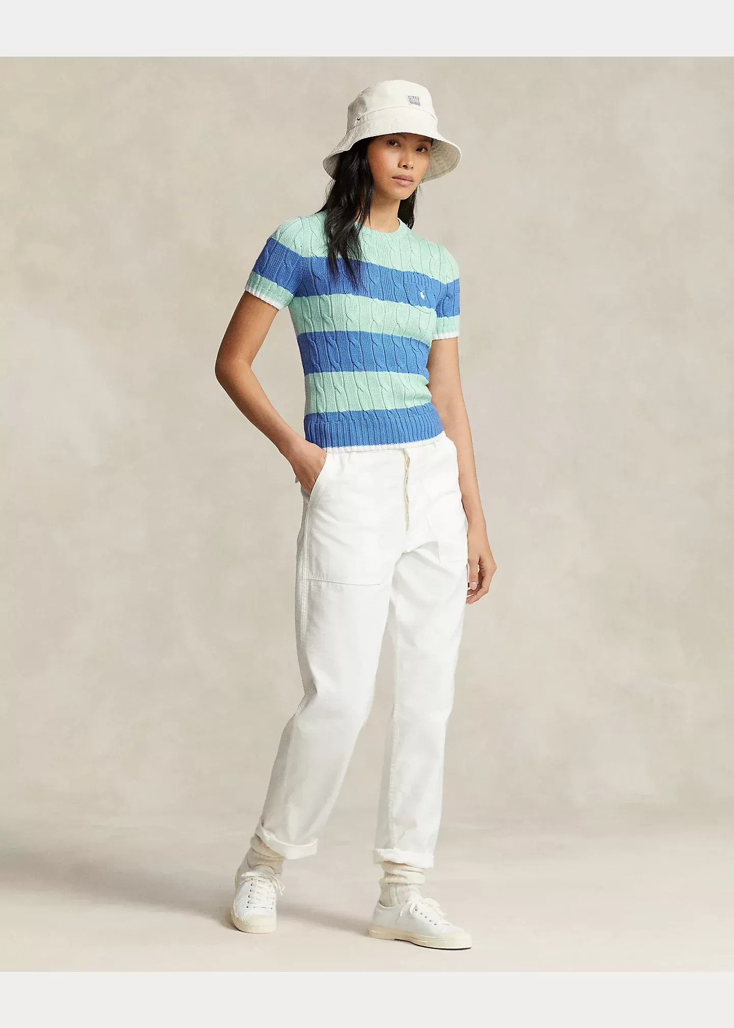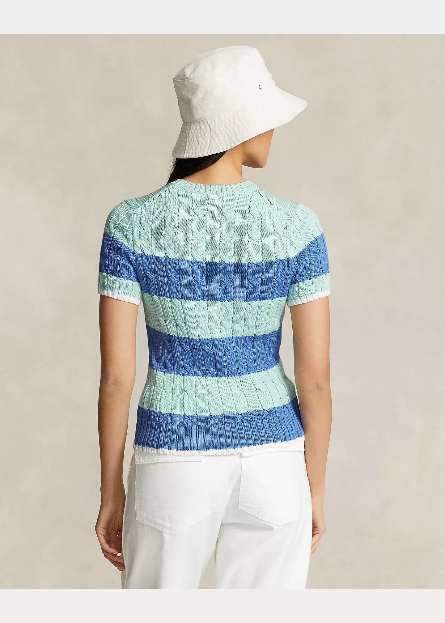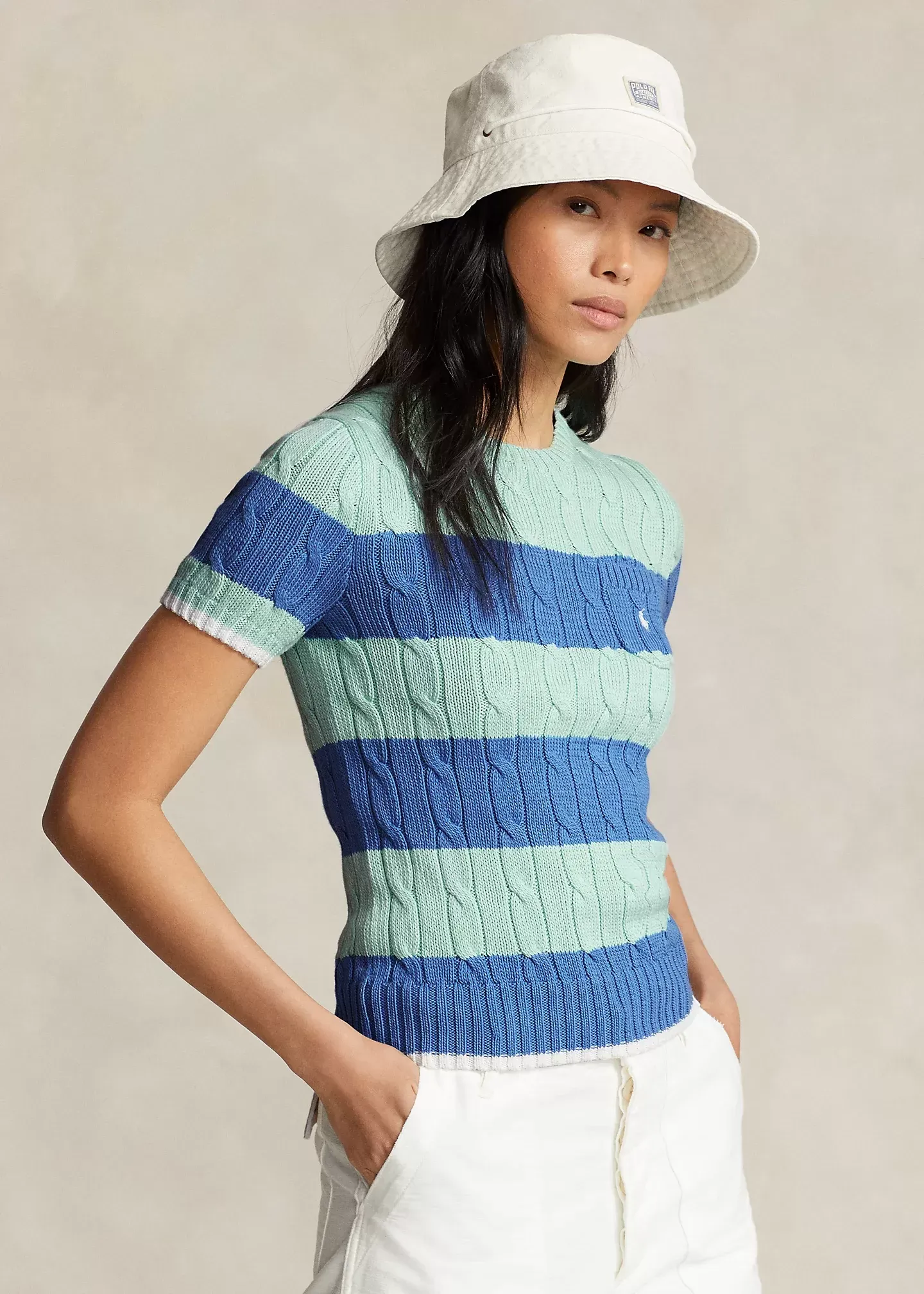 Cable-knit with pure cotton, this short-sleeve jumper is finished with two-tone stripes and our signature embroidered Pony on the chest pocket. Ralph Lauren partners with Better Cotton™ to improve cotton farming globally.